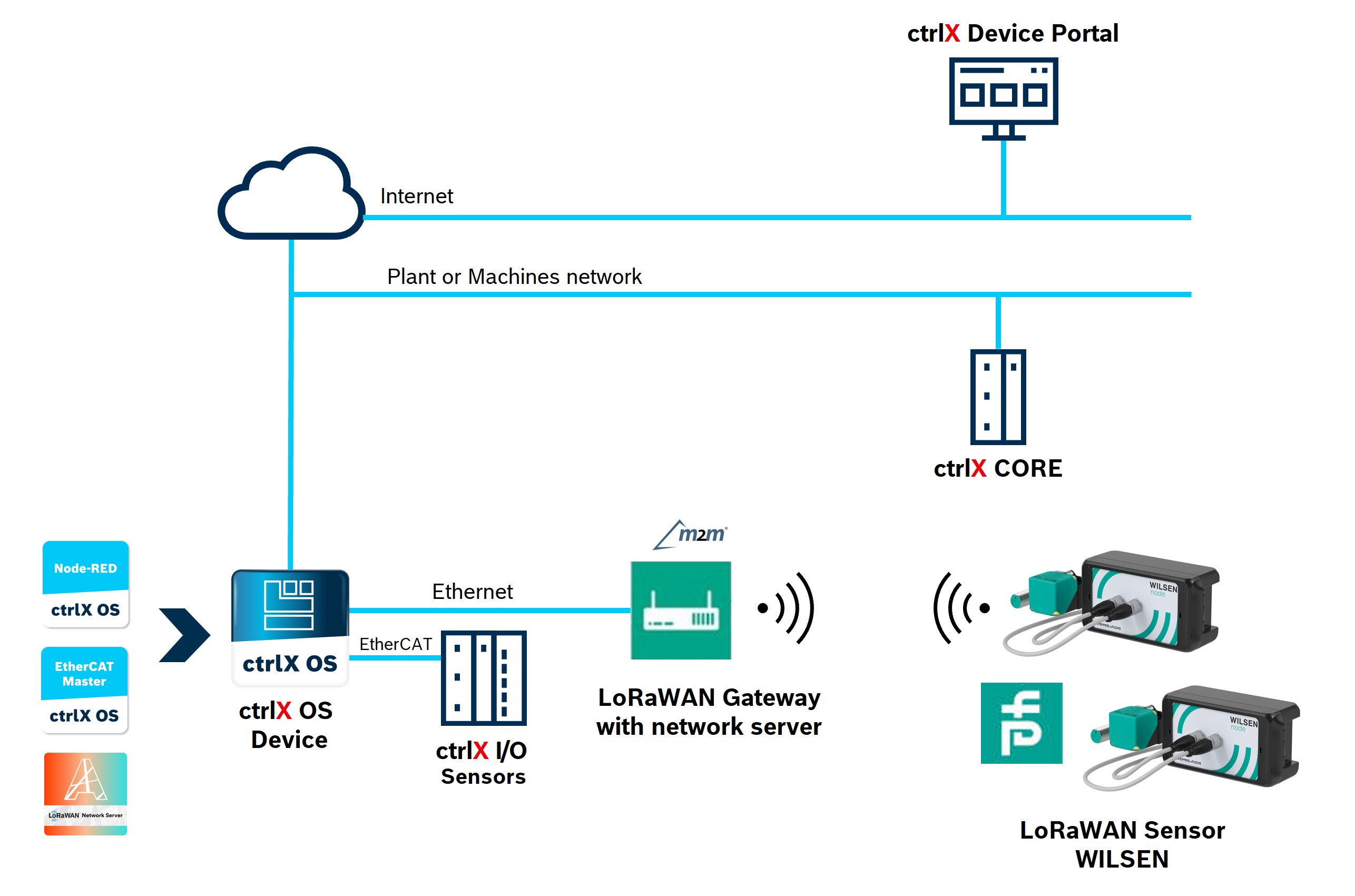Neue Topologien werden möglich: Daten von LoRaWAN-Sensoren lassen sich direkt in die Anwendung integrieren. Die energieeffiziente Technologie erweitert durch ihre große Reichweite die Datenerfassung in der Fabrik. Auch eine bidirektionale Nutzung, beispielsweise zur Aktivierung von Aktuatoren, ist möglich.