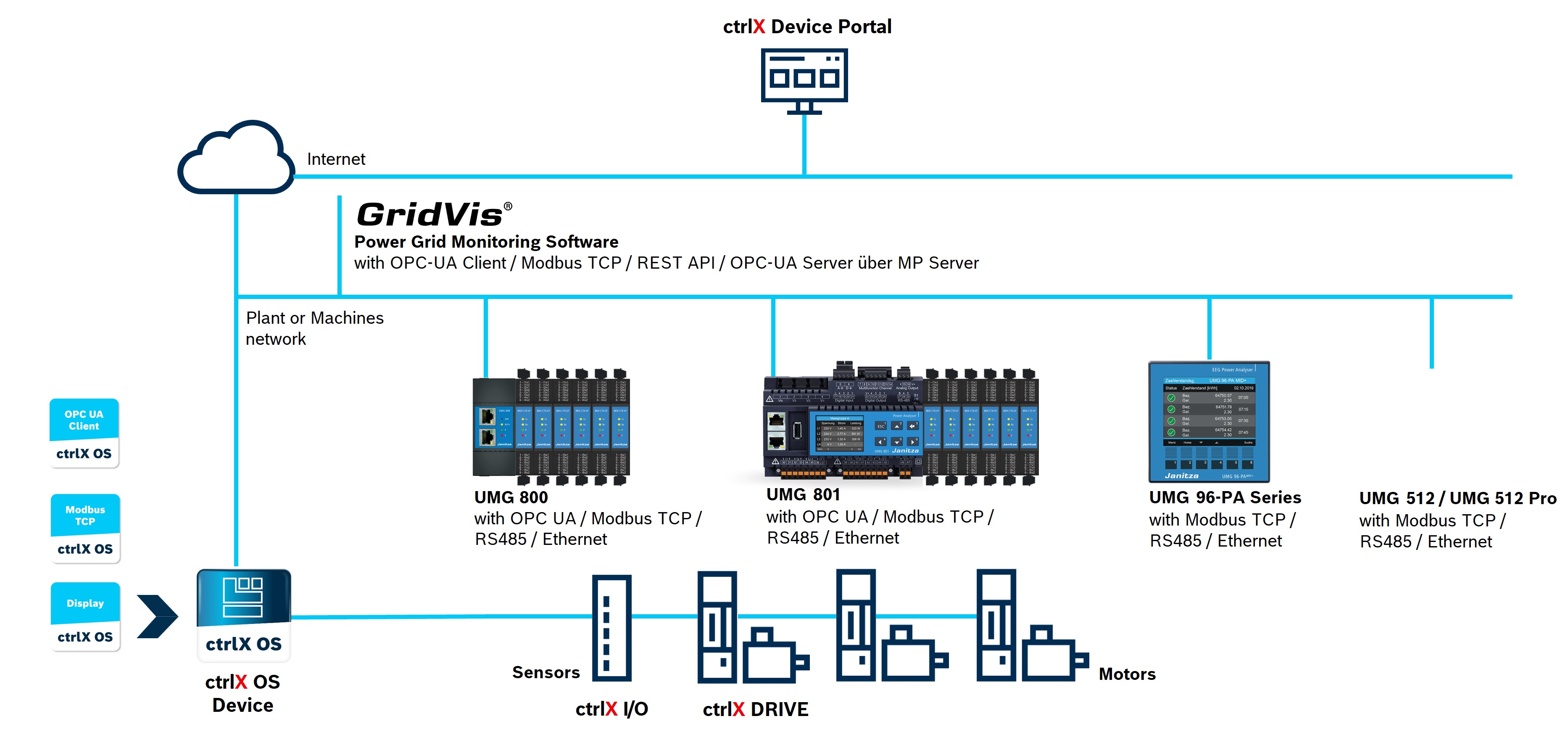 Verbindung von Janitza-Geräten über ModbusTCP oder OPC UA mit ctrlX OS-Geräten.