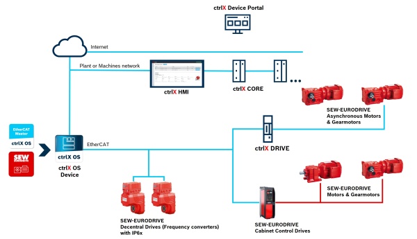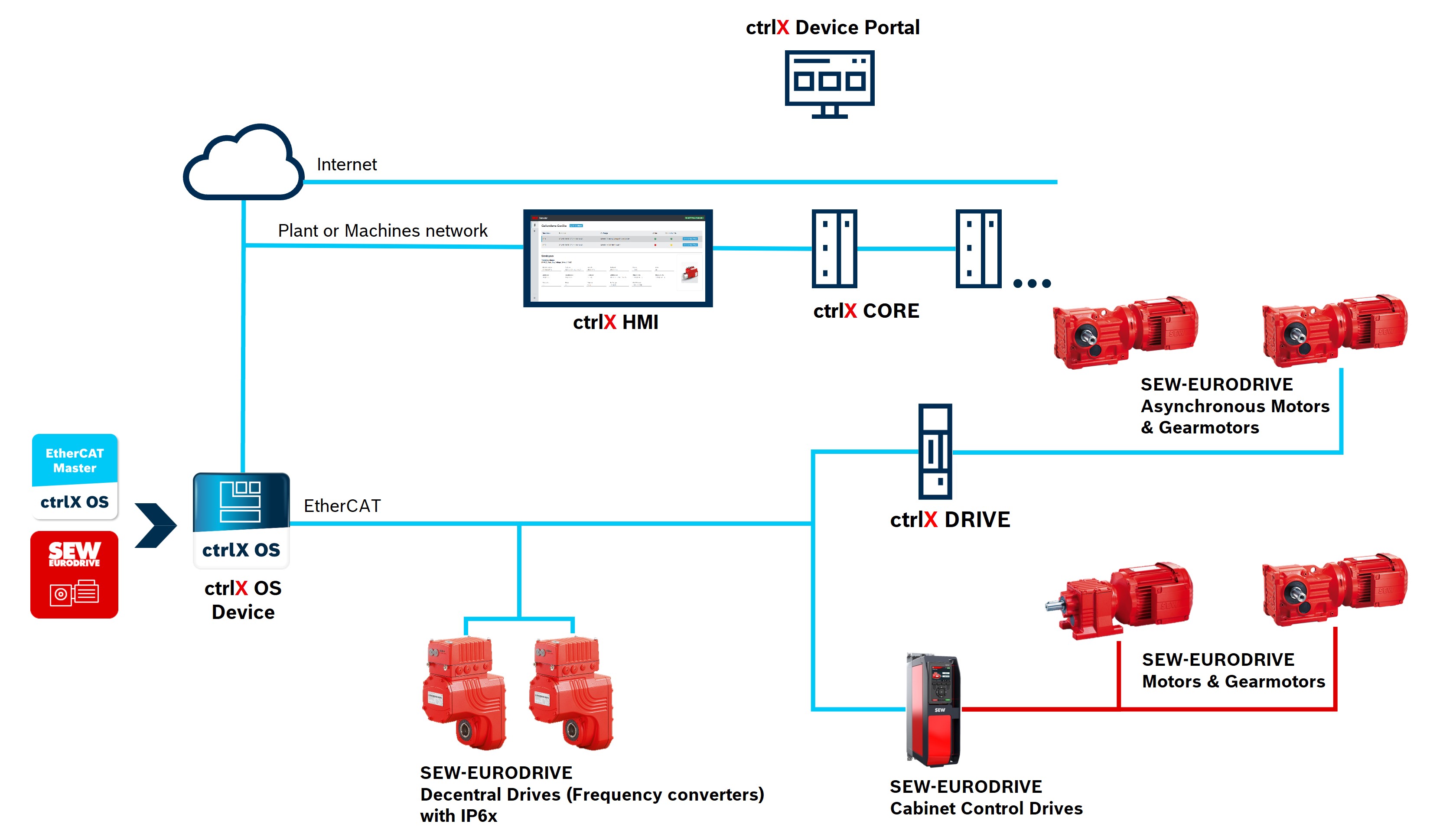 Der SEW-EURODRIVE Connector für ctrlX OS ermöglicht die Verbindung zwischen dem ctrlX OS Device und dem modularen Automatisierungssystem MOVI-C® - basierend auf dem etablierten CiA 402 Standard.